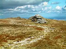 Geologically the region is divided into the largely igneous and metamorphic west and sedimentary east, the dividing line slightly to the west of the River Exe.[9] Cornwall and West Devon's landscape is of rocky coastline and high moorland, notably at Bodmin Moor and Dartmoor. These are due to the granite and slate that underlie the area. The highest point of the region is High Willhays, at 2,038 feet (621 m), on Dartmoor.[10] In North Devon the slates of the west and limestones of the east meet at Exmoor National Park. The variety of rocks of similar ages seen has led to the county's name being given to that of the Devonian period.