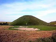 At the end of the last Ice Age the Bristol Channel was dry land, but subsequently the sea level rose, resulting in major coastal changes. The Somerset Levels were flooded, but the dry points such as Glastonbury and Brent Knoll are known to have been occupied by Mesolithic hunters.[39] The landscape at this time was tundra. Britain's oldest complete skeleton, Cheddar Man, lived at Cheddar Gorge around 7150 BC (in the Upper Palaeolithic or Old Stone Age), shortly after the end of the ice age;[40] however, it is unclear whether the region was continuously inhabited during the previous 4000 years, or if humans returned to the gorge after a final cold spell. A Palaeolithic flint tool found in West Sedgemoor is the earliest indication of human presence on the Somerset Levels.[41] During the 7th millennium BC the sea level rose and flooded the valleys, so the Mesolithic people occupied seasonal camps on the higher ground, indicated by scatters of flints.[41] The Neolithic people continued to exploit the reed swamps for their natural resources and started to construct wooden trackways. These included the Post Track and the Sweet Track. The Sweet Track, dating from the 39th century BC, is thought to be the world's oldest timber trackway and was once thought to be the world's oldest engineered roadway.[12] The Levels were also the location of the Glastonbury Lake Village as well as two lake villages at Meare.[42] Stonehenge, Avebury and Stanton Drew are perhaps the most famous Neolithic sites in the UK.