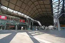 Southern Cross was redeveloped by the Civic Nexus consortium, following an innovative design by Grimshaw Architects and Jackson Architecture which features an undulating roof.[22] Construction began in October 2002 and was completed in late 2006, with the majority of the transport facilities finished in time for the 2006 Commonwealth Games. The central features of the design include a wave-shaped roof, a new entrance and concourse on Collins Street, a new coach interchange, a new food court, a bar/restaurant, separate retail outlets inside the station and a separate shopping complex between Bourke and La Trobe streets.