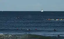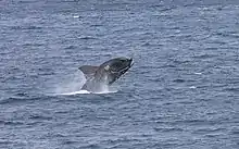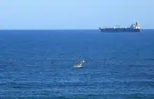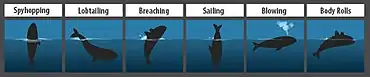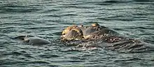 Like other right whales, they are rather active on the water surface and curious towards human vessels. Southern rights appear to be more active and tend to interact with humans more than the other two northern species. One behaviour unique to the southern right whale, known as tail sailing, is that of using their elevated flukes to catch the wind, remaining in the same position for a considerable amount of time. It appears to be a form of play and is most commonly seen off the coast of Argentina and South Africa.[13] Some other species such as humpback whales are also known to display. Right whales are often seen interacting with other cetaceans, especially humpback whales[23] and dolphins. There have been records of southern rights and humpbacks thought to be involved in mating activities off Mozambique,[24] and along Bahia, Brazil.[25]