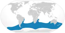 The southern right whale spends summer in the far Southern Ocean feeding, probably close to Antarctica. If the opportunity arises, feeding can occur even in temperate waters such as along Buenos Aires.[41][42] It migrates north in winter for breeding and can be seen by the coasts of Argentina, Australia, Brazil, Chile, Namibia, Mozambique, Peru, Tristan de Cunha, Uruguay, Madagascar, New Zealand and South Africa; whales have also been known to winter in sub-Antarctic regions.[43][44] It appears that the South American, South African and Australasian groups intermix very little if at all, because maternal fidelity to feeding and calving habitats is very strong. The mother also passes these choices to her calves.[45]