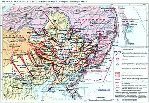 The 1st Far Eastern Front was to form the eastern half of the pincer movement. This attack involved the 1st Red Banner Army, the 5th Army and the 10th Mechanized Corps striking towards Mudanjiang (or Mutanchiang).[1] Once that city was captured, this force was to advance towards the cities of Jilin (or Kirin), Changchun and Harbin.[1] Its final objective was to link up with the forces of the Transbaikal Front at Changchun and Jilin thus closing the double envelopment movement.