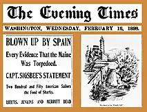 The business community had just recovered from a deep depression and feared that a war would reverse the gains. Accordingly, most business interests lobbied vigorously against going to war.[21] President William McKinley ignored the exaggerated news reporting and sought a peaceful settlement.[22] Though not seeking a war, McKinley made preparations in readiness for one. He unsuccessfully sought accommodation with Spain on the issue of independence for Cuba.[23] However, after the U.S. Navy armored cruiser Maine mysteriously exploded and sank in Havana Harbor on February 15, 1898, political pressures pushed McKinley into a war that he had wished to avoid.[24]