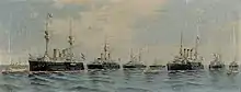 Following Dewey's victory, Manila Bay became filled with the warships of other naval powers.[106] The German squadron of eight ships, ostensibly in Philippine waters to protect German interests, acted provocatively—cutting in front of American ships, refusing to salute the American flag (according to customs of naval courtesy), taking soundings of the harbor, and landing supplies for the besieged Spanish.[108]