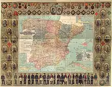 The combined problems arising from the Peninsular War (1807–1814), the loss of most of its colonies in the Americas in the early 19th-century Spanish American wars of independence, and three Carlist Wars (1832–1876) marked a low point for Spanish colonialism.[36] Liberal Spanish elites like Antonio Cánovas del Castillo and Emilio Castelar offered new interpretations of the concept of "empire" to dovetail with the emerging Spanish nationalism. Cánovas made clear in an address to the University of Madrid in 1882[37][38] his view of the Spanish nation as based on shared cultural and linguistic elements—on both sides of the Atlantic—that tied Spain's territories together.