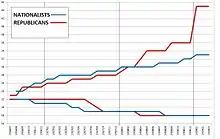 The Spanish Civil War (Spanish: Guerra Civil Española)[note 2] was a civil war in Spain fought from 1936 to 1939 between the Republicans and the Nationalists. Republicans were loyal to the left-leaning Popular Front government of the Second Spanish Republic, and consisted of various socialist, communist, separatist, anarchist, and republican parties, some of which had opposed the government in the pre-war period.[12] The opposing Nationalists were an alliance of Falangists, monarchists, conservatives, and traditionalists led by a military junta among whom General Francisco Franco quickly achieved a preponderant role. Due to the international political climate at the time, the war had many facets and was variously viewed as class struggle, a religious struggle, a struggle between dictatorship and republican democracy, between revolution and counterrevolution, and between fascism and communism.[13] According to Claude Bowers, U.S. ambassador to Spain during the war, it was the "dress rehearsal" for World War II.[14] The Nationalists won the war, which ended in early 1939, and ruled Spain until Franco's death in November 1975.