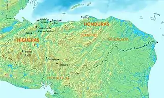 López de Salcedo moved Trujillo upslope from its previous swampy location.[89] In 1528, López de Salcedo spent a month in the Olancho Valley, which at this time was likely to have been inhabited by Pech. He attempted to bring the inhabitants under his control, spurring them into preparation to resist further Spanish incursions.[114] He hanged several indigenous leaders who had taken part in the attack on Natividad de Nuestra Señora, and imposed such harsh obligations upon the natives that they burned their villages and their crops and fled into the mountains. In Olancho, López de Salcedo unsuccessfully clashed with rival Spaniards that he found still there. Unrest among the natives spread widely, from Comayagua to as far south as Nicaragua, causing difficulties in procuring provisions, and presenting constant danger to the expedition. Nevertheless, he continued onwards to León, in Nicaragua.[113] At about this time, Pedrarias Dávila was appointed governor of Nicaragua after vigorously protesting his loss of governorship over Castilla del Oro.[115]