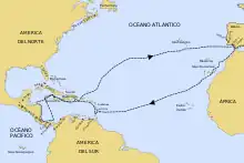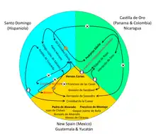 Christopher Columbus discovered the New World for the Kingdom of Castile and Leon in 1492. Private adventurers thereafter entered into contracts with the Spanish Crown to conquer the newly discovered lands in return for tax revenues and the power to rule.[17] The Spanish founded Santo Domingo on the Caribbean island of Hispaniola in the 1490s.[18] In the first decades after their discovery of the new lands, the Spanish colonised the Caribbean and established a centre of operations on the island of Cuba.[19] After the discovery of Honduras by Columbus in 1502, no concerted effort to conquer the territory took place until 1524.[20]