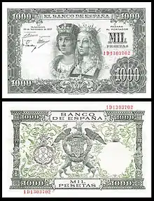 The first Nationalist Bank of Spain issues were made in 1936, in denominations of Pts 5, Pts 10, Pts 25, Pts 50, Pts 100, Pts 500, and Pts 1,000. Pta 1 and Pts 2 notes were added in 1937. From the mid-1940s, denominations issued were Pta 1, Pts 5, Pts 25, Pts 50, Pts 100, Pts 500, and Pts 1,000. The Pta 1, Pts 5, Pts 25, and Pts 50 were all replaced by coins by the late 1950s.