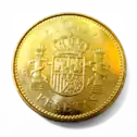 The peseta was subdivided into 100 céntimos or, informally, 4 reales. The last coin of any value under one peseta was a 50 cts coin issued in 1980 to celebrate Spain's hosting of the 1982 FIFA World Cup.[6] The last 25-céntimo coin (or real) was dated 1959, the ten céntimos also dated 1959; both coins bore the portrait of Franco. The 1-céntimo coin was last minted in 1913 and featured King Alfonso XIII.[7] The 1⁄2-céntimo coin was last minted in 1868 and featured Queen Isabel II.[8]