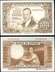 The first Pta 1 coins bearing the portrait of Francisco Franco were issued in 1947. Cupro-nickel Pts 5 followed in 1949. In 1949, holed cupro-nickel 50 cts were introduced, followed by aluminium-bronze Pts 2+1⁄2 in 1954, cupro-nickel Pts 25 and Pts 50 in 1958 and smaller aluminium 10 and 25 céntimos in 1959. Silver Pts 100 were issued between 1966 and 1969, with aluminium 50 céntimos introduced in 1967. In 1966 Franco's profile was redesigned to depict a more recent representation of the leader.