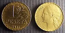 In 1934, the Second Spanish Republic issued its first coins in the denomination of 25 cts and 50 cts and Pta 1. The 25 cts and silver Pta 1 were the same size and composition as the earlier Royal issues, whilst the 50 cts was struck in copper. In 1937 a 5 cts coin was struck in iron and a new Pta 1 in brass. An iron 10 cts coin was also produced in 1938 but never issued into circulation, unknown whether due to its close resemblance to the 5cts or because the government of issue fell before it could be released. All of these replaced symbols and images related to the monarchy. The brass Pta 1 was sometimes nicknamed La Rubia (The Blonde), as it featured a woman's face in a gold-coloured alloy.[20]