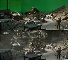 Digital Domain worked on the Staten Island Ferry battle, creating the CGI versions of Spider-Man, the Vulture suit, Iron Man, and Spider-Man's drone. Digital Domain was able to LIDAR an actual Staten Island Ferry, as well as the version created on set, to help with creating their digital version.[164] Lou Pecora, visual effects supervisor at Digital Domain, called that sequence "brutal" because "the way they were shot, it was lit to be a certain time of day, and afterwards it was decided to change that time of day."[190] Sony Pictures Imageworks created much of the third act of the film when Parker confronts Toomes on the plane and beach in his homemade suit, and Toomes is in an upgraded Vulture suit. Some elements of Vulture's first suit were shared with Imageworks, but the remainder were created by them "based on a maquette". For the plane's cloaking ability, Imageworks was inspired by Adaptiv IR Camouflage tank cloaking system by BAE Systems, which "uses a series of titles to cloak against infrared". For their web design, which was based on the one created for Civil War, Digital Domain referenced polar bear hair because of its translucent nature. Imageworks also looked to the Civil War webs, as well as to those they had created for previous Spider-Man films, in which "the web[s] had [...] tiny barbs that aided in hooking on to things." For this film, they "dialed back the barbs" to line up more closely with the other web designs created for this film.[164] Method Studios worked on the Washington Monument sequence.[188] Iron Man's armor in the film, the Mark XLVII, is a recolored version of the MK XLVI armor introduced in Civil War; this was done because Sony did not have the budget to create a new Iron Man suit. Feige requested the color scheme resemble the Ultimate Iron Man armor from the comics.[191]