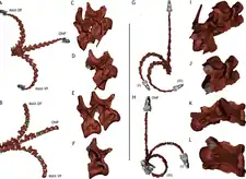 Since Spinophorosaurus is one of the most completely known basal sauropods, it is a good model for biomechanical studies that help to understand sauropod biology and the function of anatomical features. Manipulation of the 3D model by Vidal and colleagues in 2015 showed that each of the frontmost 20 tail vertebrae could deflect up to 20º, and 8–10º in sideways flexion, before limited by the bone morphology. The actual range of movement in a live animal would have been smaller, as the soft tissue as well as the large chevron bones would have been a limiting factor. The first 20 tail vertebrae also became longer towards the end of the tail, as seen in diplodocids, and were powered by enlarged hypaxial musculature, as indicated by the large chevron bones and upwards-angled transverse processes in the first tail vertebrae. Movement in the rear part of the tail was limited as the chevrons were overlapping, as is also the case in dromaeosaurids and ankylosaurids. Together, these features of the tail may have been part of a specialised function, which is unknown.[29] Joger and colleagues argued in 2009 that the supposed spikes formed a thagomiser at the end of the tail that would have been used for defence against predators.[2]