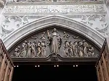 The cathedral's masonry was laid during summer as the stonework could not be laid in the cold.[50] By late 1870, the marble walls had been built to a height of 54 feet (16 m) and the transept was finished.[50][62] The entrance on Fifth Avenue, measuring 70 feet (21 m) tall, had also been finished.[62] Over a hundred workers were busy quarrying marble from Pleasantville, north of New York City. The marble was transported down to New York City via the Harlem Railroad, where a branch track led to the new cathedral's site.[50] The construction of the new cathedral drew relatively little interest for New York City's non-Catholic population,[63] though several commentators praised the cathedral's design.[31] An anonymous author for the Real Estate Record and Guide wrote that the new St. Patrick's Cathedral was the "most gorgeous ecclesiastical edifice on this continent", though the critics perceived the buttresses on the north and south sides of the facade as "altogether unnecessary".[64] A reporter for the New York World, probably Montgomery Schuyler, wrote in 1871 that the cathedral would be "one of the leading ecclesiastical structures in the world".[31]