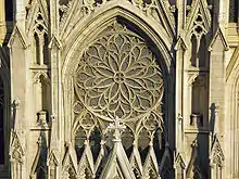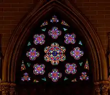 There are 103 windows on the cathedral in total.[68][76][lower-alpha 3] The windows are glazed by two thicknesses of sash and glass, set 2 inches (51 mm) apart, to regulate interior temperatures and prevent air drafts. The exterior sashes are glazed with figured glass in lead sash, while the interior sashes are glazed with stained glass.[25][208] The windows of the clerestory were made by Morgan Brothers.[208] The cathedral had been constructed with 57 stained-glass windows: 37 representing scenes from Scripture and 20 representing geometrical shapes.[206][207] Forty-five of the original windows were manufactured by Nicholas Lorin and Henry Ely in France.[209] Other stained glass windows were added later.[169][170] Renwick's original sketches show that the tracery near each window was designed with two grooves: one for stained glass and one for protective glazing.[196]
