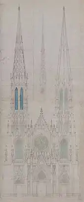 In 1853, Hughes announced that he had hired the firm Renwick & Rodrigue to design a cathedral on Fifth Avenue between 50th and 51st Streets.[23] One partner in the firm, William Rodrigue, was Hughes's brother-in-law.[29][30] The other partner, James Renwick Jr., was largely responsible for designing the new St. Patrick's Cathedral.[23][29] Renwick spent three years in Europe to look for design influences for New York City's new Catholic cathedral.[31] He took particular inspiration from the unfinished Cologne Cathedral.[31][32] Renwick & Rodrigue originally planned a larger cathedral than the structure that was ultimately built. Hughes requested in 1857 that the firm reduce the dimensions of the new cathedral.[25][33] To make way for the clergy's and archbishop's residences, the ambulatory was removed from the plans.[33][34] The area behind the apse would have contained a chapel dedicated to the Blessed Virgin, but this was removed entirely.[35] The numerous heavy buttresses in the design were also removed.[31]