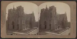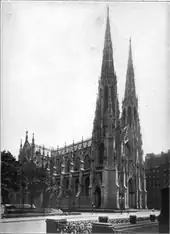 The new St. Patrick's Cathedral opened on May 25, 1879.[75][76][77] Thirty-five bishops and six archbishops attended the dedication.[75][77][78] St. Patrick's was met with a generally positive reception from the media.[61] The Baltimore Sun, for example, called it the "finest church edifice on the American continent".[79] Not all critics spoke of the cathedral positively; journalist Clarence Cook authored a criticism that architectural historian Robert A. M. Stern characterized as being "underpinned with religious and ethnic bigotry".[61] Cook perceived the facade as being full of "clumsy repetition", and he wrote of the interior: "Words cannot express the paltry character of the internal finish of this vaunted structure."[80] The new St. Patrick's Cathedral and Temple Emanu-El comprised the first non-Protestant houses of worship on the midtown section of Fifth Avenue.[81] At the time, the cathedral was far removed from the developed portions of the city.[82] The first bishop consecrated in the new cathedral was the Michael J. O'Farrell of Trenton, New Jersey, who became the first bishop of the Diocese of Trenton.[83]