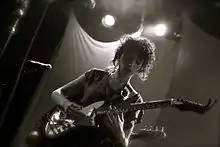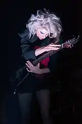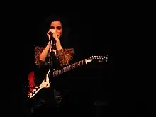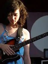 Possessing a mezzo-soprano voice,[97][98][99] Clark's music has been noted for its wide array of instruments and complex arrangements, as well as its polysemous lyrics, which have been described as teetering between "happiness and madness".[30] In response, Clark has said, "I like when things come out of nowhere and blindside you a little bit. I think any person who gets panic attacks or has an anxiety disorder can understand how things can all of a sudden turn very quickly. I think I'm sublimating that into the music."[20] In addition to guitar, Clark also plays bass, piano, organ, and theremin. Her music also often features violins, cellos, flutes, trumpets, clarinets, and other instruments.[100] Her musical style has been characterised as rock,[101][102] pop,[103][104] art rock[105][103] and indie rock,[106][107] incorporating a wide range of influences including experimental rock, chamber pop, electropop, soft rock, and cabaret jazz.[33][108]