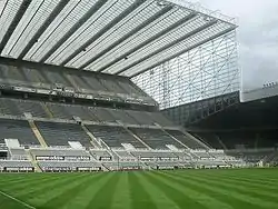 St James' Park has been the home ground of Newcastle United F.C since 1892 and has been used for football since 1880.[2] Throughout its history, the desire for expansion has caused conflict with local residents and the local council.[3] This has led to proposals to move at least twice in the late 1960s,[4][5] and a controversial 1995 proposed move to nearby Leazes Park. Reluctance to move has led to the distinctive lop-sided appearance of the present-day stadium's asymmetrical stands.[6]