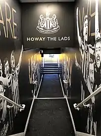 The Milburn stand is the 'main' stand of the stadium, housing the main entrance, lifts and escalators behind a glass fronted atrium. The dugouts and player's tunnel is located in the traditional position of the middle of the main stand. Behind the seating terraces of the stands, the Milburn/Leazes structure contains four concourse levels, the Gallowgate End has three concourse levels, and the East stand has two concourse levels.[2]