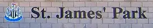 In May 2008 BBC Look North examined the case for adding an extra 's', to denote the ground is "the park of St James".[45] The club stated that the ground is named after its neighbouring street, St James Street, which predates the ground,[45] although it was pointed out the road sign of that street, and that of the adjacent St James Terrace, did not feature apostrophes.[45] The BBC stated that both local newspapers The Evening Chronicle and The Journal write the name with a second 's', reinstating it partially in response to reader complaints after a period of publishing stories without it.[45]