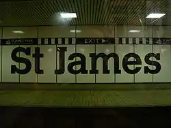 St James' Park is spelt with James' featuring one s and an apostrophe mark, as seen on the signage of the St James' Park steps outside the entrance to the stadium, and signage inside the adjacent Metro station. The use of an apostrophe is in contrast with the name of the Metro station itself, which is signed as St James Metro station, and with the street signs[45] of the nearby St James Street[46] and St James Terrace.[47] Further, the use of one s and an apostrophe mark differs from the common convention of adding a second s to monosyllabic possessives ending in s, as is the case with the well-known public space in London: St James's Park.