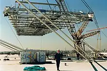 The stadium was officially ready for construction following the government's selection of manufacturers, Bouygues, Dumez, and SGE, and the signing of building permits on 30 April 1995.[3][4] With only 31 months to complete the stadium, construction commenced on 2 May 1995. The laying of the first cornerstone took place five months later on 6 September. After over a year of construction, over 800,000 m² of earthworks had been created and as much as 180,000 m³ of concrete had been poured. The installation of the roof, which cost €45 million, and the mobile platform also took more than a year to complete.