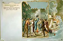 One member of the British Parliament argued that the American colonists were no different from the 90-percent of Great Britain who did not own property and thus could not vote, but who were nevertheless "virtually" represented by land-owning electors and representatives who had common interests with them.[5] Daniel Dulany, a Maryland attorney and politician, disputed this assertion in a widely read pamphlet, arguing that the relations between the Americans and the English electors were "a knot too infirm to be relied on" for proper representation, "virtual" or otherwise.[6] Local protest groups established Committees of Correspondence which created a loose coalition from New England to Maryland. Protests and demonstrations increased, often initiated by the Sons of Liberty and occasionally involving hanging of effigies. Very soon, all stamp tax distributors were intimidated into resigning their commissions, and the tax was never effectively collected.[7][8][9]
