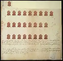 A roof sheet of one penny stamps submitted for approval to the Commissioners of Stamps by their engraver on May 10, 1765