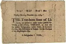Most printers were critical of the Stamp Act, although a few Loyalist voices did exist. Some of the more subtle Loyalist sentiments can be seen in publications such as The Boston Evening Post, which was run by British sympathizers John and Thomas Fleet. The article detailed a violent protest that occurred in New York in December, 1765, then described the riot's participants as "imperfect" and labeled the group's ideas as "contrary to the general sense of the people."[68] Vindex Patriae denigrated the colonists as foreign vagabonds and ungrateful Scots-Irish subjects determined to "strut and claim an independent property to the dunghill".[69] These Loyalists beliefs can be seen in some of the early newspaper articles about the Stamp Act, but the anti-British writings were more prevalent and seem to have had a more powerful effect.[70]