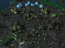 Wings of Liberty features approximately the same number of units as the original StarCraft.[13] Some units from the original game have returned, some featuring new upgrades and abilities. For example, the Protoss Zealot, a melee unit from the original game, has the researchable ability to dash forward and quickly reach nearby enemies as a refinement of its speed upgrade from the original. Other units have been replaced or removed.[14][15] Other changes to unit design have been inspired by story events in StarCraft and its expansion StarCraft: Brood War, replacing old units with new or renamed versions which sport different attributes and abilities.[14] Units in StarCraft II have new abilities, compared to the original, that encourage more complex interaction with the game environment. Among these are the inclusion of units that can traverse varying levels of terrain,[16] or have the ability to teleport short distances.[14] Some Protoss units can be warped into pylon-powered areas using the Warp Gate, a slight modification of an existing building called the Gateway.[14][17] StarCraft II's campaign has units that are only playable in the campaign and not in the regular multiplayer mode, though they are available for custom maps. These mostly consist of units that have been scrapped from development such as the Terran Diamondback as well as various returning units from the original StarCraft such as the Terran Wraith and Goliath. The campaign features hirable mercenaries, modified versions of certain units with enhanced attributes such as health or damage that become available for hire once the standard unit is unlocked.[18]