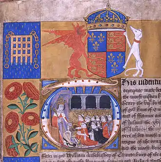 The first reference to the "star chamber"[lower-alpha 2] is in 1398, as the Sterred chambre; the more common form of the name appears in 1422 as le Sterne-chamere. Both forms recur throughout the fifteenth century, with Sterred Chambre last attested as appearing in the Supremacy of the Crown Act 1534 (establishing the English monarch as head of the Church in England). The origin of the name has usually been explained as first recorded by John Stow, writing in his Survey of London (1598), who noted "this place is called the Star Chamber, at the first all the roofe thereof was decked with images of starres gilted".[2][3] Gold stars on a blue background were a common medieval decoration for ceilings in richly decorated rooms: the Star Chamber ceiling itself is still to be seen at Leasowe Castle, Wirral, and similar examples are in the Scrovegni Chapel in Padua and elsewhere.