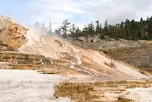 The planet Vulcan setting was created using a mixture of on-location photography at Minerva Hot Springs in Yellowstone National Park and set recreation.[15]: 165 Yellowstone was selected after filming in Turkish ruins proved to be too expensive. Securing permission for filming the scenes was difficult in the middle of the summer tourist season, but the Parks Department acquiesced so long as the crew remained on the boardwalks to prevent damage to geological formations. Zuberano, who had helped select the site for the shoot, traveled to Yellowstone and returned with a number of photos. Minor also made a trip and returned to create a large painting depicting how the scene might look. In consultations with Michelson, the crew decided to use miniatures in the foreground to create the Vulcan temples, combined with the real hot springs in the background. In the film, the bottom third of the frames were composed of miniature stairs, rocks, bits of red glass and a Vulcan statue. The center of the frame contained Nimoy's shots and the park setting, while the final third of the frame was filled with a matte painting. On August 8, the day after production began at Paramount, an 11-person second unit left for Yellowstone. The sequence took three days to shoot.[15]: 172–6