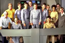The film was the first major Hollywood adaptation of a television series that had been off the air for nearly a decade to retain its original principal cast.[21] The actors—who had agreed to appear in the new movie, with contracts as-yet unsigned pending script approval—grew anxious about the constant delays, and pragmatically accepted other acting offers while Roddenberry worked with Paramount.[20] The studio decided to turn the project over to the television division, reasoning that since the roots of the franchise lay in television, the writers would be able to develop the right script. A number of screenwriters offered up ideas that were summarily rejected. As Paramount executives' interest in the film waned, Roddenberry, backed by fan letters, applied pressure to the studio.[15]: 25 In June 1976, Paramount assigned Jerry Isenberg, a young and active producer, to be executive producer of the project, with the budget expanded to $8 million. Povill was tasked with finding more writers to develop a script. His list included Edward Anhalt, James Goldman, Francis Ford Coppola, George Lucas, Ernest Lehman, and Robert Bloch. To cap off his list, Povill put as his last recommendation "Jon Povill—almost credit: Star Trek II story (with Roddenberry). Will be a big shot some day. Should be hired now while he is cheap and humble." The result was a list of 34 names, none of whom were chosen to pen the script.[15]: 26–8 Finally, British screenwriters Chris Bryant and Allan Scott, who had penned the Donald Sutherland thriller Don't Look Now, were hired to write a script. Bryant believed he earned the screenwriting assignment because his view of Kirk resembled what Roddenberry modeled him on: "one of Horatio Nelson's captains in the South Pacific, six months away from home and three months away by communication".[15]: 28 Povill also wrote up a list of possible directors, including Coppola, Steven Spielberg, Lucas, and Robert Wise, but all were busy at the time (or unwilling to work on the small budget).[15]: 29 Philip Kaufman signed on to direct and was given a crash course in the series. Roddenberry screened ten episodes from the original series for him, including the most representative of the show and those he considered most popular: "The City on the Edge of Forever", "The Devil in the Dark", "Amok Time", "Journey to Babel", "Shore Leave", "The Trouble with Tribbles", "The Enemy Within", "The Corbomite Maneuver", "This Side of Paradise", and "A Piece of the Action". Early work was promising, and by the fall of 1976, the project was building momentum. During this time, fans organized a mail campaign that flooded the White House with letters, influencing Gerald Ford to rechristen the Space Shuttle Constitution the Enterprise,[15]: 30 and Roddenberry and most of the Star Trek cast were present for its rollout.