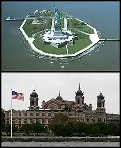 The Statue of Liberty is a world-famous symbol of freedom, given in 1886 by France to the United States in celebration of American Independence. Nearby Ellis Island was the first stop for millions of immigrants to the U.S. in the late 19th and early 20th centuries.[20] The national monument recalls this period of massive immigration to the United States.[21]