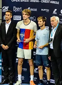 At the US Open, Tsitsipas made his main draw debut, but was upset in the second round by fellow Next Gen player Daniil Medvedev.[57] He cited fatigue as a factor in the loss and proceeded to exit before the quarterfinals at three of his next four tournaments as well.[58][59] However, Tsitsipas was able to recover at the Stockholm Open. Playing as the third seed, he defeated second seed and No. 14 Fabio Fognini in the semifinals before winning in the final against veteran qualifier Ernests Gulbis. With the victory, he became the first Greek player to win an ATP title.[60] Tsitsipas closed out his season at the Next Gen ATP Finals. He was the top seed at the event and was drawn with Frances Tiafoe, Hubert Hurkacz, and Jaume Munar. Tsitsipas swept his group and defeated Andrey Rublev to advance to the final against second seed Alex de Minaur.[61][62] He defeated de Minaur in four sets to win the Next Gen Finals.[63] At the end of the year, Tsitsipas was named the ATP Most Improved Player for his breakthrough season.[64]