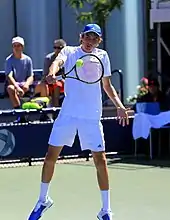Tsitsipas began playing low-level ITF Futures events in Greece in 2013 shortly after turning 15, not long after he started competing on the junior tour.[31] He qualified for his first event on the ATP Challenger Tour at the Burnie International in early 2015 while still 16 years old, but lost his only main draw match to Benjamin Mitchell.[32] Tsitsipas won his first Futures title later that year and would go on to win a total of eleven such titles, five in singles and six in doubles, through the end of 2016.[31] He also won his first Challenger match near the end of 2015 in Mohammedia in Morocco.[32] Tsitsipas returned to Morocco a year later and reached his first two Challenger finals in back-to-back weeks at Mohammedia and Casablanca.[33] This success in Africa helped him crack the top 200 later that October.[34] Towards the end of that month, Tsitsipas was granted a qualifying wild card into the Swiss Indoors in Basel, his first ATP Tour appearance. He defeated Rajeev Ram in the opening round, but was unable to qualify after a loss to Robin Haase.[35]