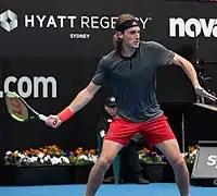 Tsitsipas started the year at the Qatar Open where he lost in the quarterfinals to world No. 5 Dominic Thiem, again as a qualifier.[44] After losing in the opening round in his Australian Open debut, his best result in the rest of the early-year hard court season was another quarterfinal at the Dubai Tennis Championships.[45][46] Tsitsipas's first breakthrough of the year came at the Barcelona Open during the clay court season, where he reached his first career ATP final without dropping a set. During the ATP 500 Series tournament, he defeated three top 20 players including No. 7 Thiem, before losing to world No. 1 Rafael Nadal in a lopsided match. With this result, Tsitsipas moved into the top 50 and became the second Greek to reach an ATP final after Nicky Kalogeropoulos in 1973.[47] His performance also gained national attention in Greece, where tennis is not a widely popular sport.[48][10] The following week at the Estoril Open, he reached another semifinal. He also picked up a third career top ten victory over No. 8 Kevin Anderson.[49]