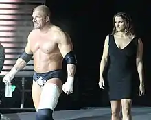 McMahon then began an on-screen relationship with wrestler Test, which led to a rivalry between him and her older brother Shane.[33] After Test defeated Shane at SummerSlam in a "Love Her Or Leave Her Match",[34] McMahon and Test went on to team together in a match on September 20, 1999, with the couple defeating Jeff Jarrett and Debra.[35] The couple were eventually engaged, but during the in-ring ceremony, Triple H showed a video which revealed that he had drugged McMahon and taken her to Las Vegas, Nevada, where they were married in a drive-through ceremony.[36][37] McMahon seemed to abhor Triple H at first, but at the inaugural Armageddon event, after Triple H defeated her father in a No Holds Barred Match, left with him after embracing. McMahon confronted Vince the next night on Raw and revealed the wedding was a planned event, which was a revenge plot against her father for the aforementioned kidnappings, thus turning her into a villainess.[37][38]