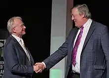 In 2012, Fry wrote the foreword to the Union of UEA Students report on the student experience for LGBT+ members.[159] As recognition of his public support for LGBT+ rights and for the Union's report, the Union of UEA Students awarded him, on 18 October 2012, Honorary Life Membership of the Union.[160] In March 2014 Fry beat David Attenborough and Davina McCall to win the Best Presenter award at the Royal Television Society Programme Awards. The award was given for his BBC2 programme Stephen Fry: Out There.[161] In an episode of QI, "M-Merriment", originally broadcast in December 2015, Fry was awarded membership of The Magic Circle.