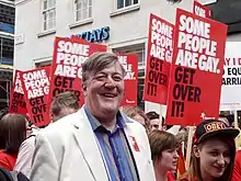 Fry struggled to keep his homosexuality secret during his teenage years at public school, and by his own account did not engage in sexual activity for 16 years until the mid-1990s.[177] When asked when he first acknowledged his sexuality, Fry quipped: "I suppose it all began when I came out of the womb. I looked back up at my mother and thought to myself, 'That's the last time I'm going up one of those'."[178] Fry was in a 15-year relationship with Daniel Cohen that ended in 2010.[179] Fry was listed number 2 in 2016 and number 12 in 2017 on the Pride Power list.[180][181]