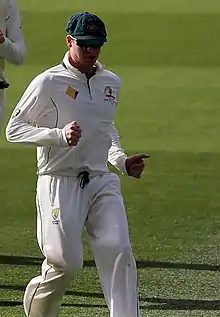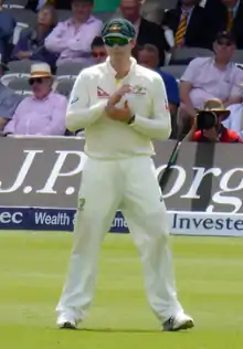Smith made his Test debut at Lord's in July 2010, playing both Tests against Pakistan in the 2010 Test series played in England.[23] He was selected mainly for his bowling, and batted down the order, although his bowling was not required in the first innings. In the second innings, he took 3 wickets for 51 as Australia won by 150 runs.[73] In the second Test he was called to bowl only ten overs and took no wickets, although he played an impressive role with the bat in the second innings. Batting with the tail, he scored 77 including nine fours and two sixes off successive balls, helping Australia to set a competitive target after having been bowled out for 88 in the first innings.[74]
