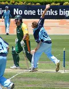 Smith made his Twenty20 cricket debut for New South Wales in a match against South Australia at Adelaide on 1 January 2008 during the six team KFC Big Bash competition.[22] Smith was the leading wicket taker at the 2008 Big Bash tournament. He took 4/15 against Queensland and finished with 9 wickets overall.[23] He was also named the second-best player of the tournament.[24] In 2011–12, the Australian T20 competition became the city-based Big Bash League featuring eight teams. Smith joined the Sydney Sixers and filled in as captain when Brad Haddin could not play due to Test duties,[25] subsequently leading the team to victory in the inaugural season. As an all-rounder, he scored 166 runs with the bat from nine matches with a strike rate of 130.71, including one half century. With the ball, he took 6 wickets at an economy rate of 8.06 per over. He also took nine catches throughout the tournament.[26] In the final match, the Sixers beat Perth Scorchers by 7 wickets while chasing down the target of 157 within 18.5 overs after the Scorchers made 5/156 in 20 overs. Smith's good form during the Big Bash League, attracted the attention of former India Captain Sourav Ganguly, and was recruited to play for the Pune Warriors India team captained by Sourav Ganguly in the 2012 Indian Premier League. Smith was also been made captain of the team for one match, when Ganguly was rested, despite Australian captain Michael Clarke being the vice-captain. He continued to play for the same franchise in 2013, under the captaincy of Angelo Mathews. Smith reunited with the Sydney Sixers in 2023 after missing two years of the Big Bash, rejoining in BBL12. In his second match, against Adelaide Strikers, he scored 101 runs off 56 deliveries as the Sixers won by 59 runs.[27] In the next match, Smith score 125* runs off 66 deliveries against Sydney Thunder.