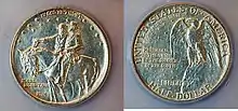 The UDC established the Stone Mountain Confederate Memorial Association (SMCMA) for fundraising and on-site supervision of the project. Venable and Borglum, both closely associated with the Klan, arranged to pack the SMCMA with Klan members.[39] The SMCMA, along with the United Daughters of the Confederacy, continued fundraising efforts. Of the $250,000 (~$3.11 million in 2021) raised, part came from the federal government, which in 1925 issued commemorative fifty-cent coins with the soldiers Robert E. Lee and Stonewall Jackson on them.[40] The image on the verso of the coin was based on The Last Meeting of Lee and Jackson,[41] executed in 1869 by Everett B. D. Fabrino Julio,[lower-alpha 1] itself an icon of Lost Cause mythology; it is now in the American Civil War Museum (until 2012 the Museum of the Confederacy).[42] When the state completed the purchase in 1960, it condemned the property to void Venable's agreement to allow the Klan perpetual right to hold meetings on the premises.[39]