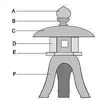 The traditional components of a stone (or bronze) lantern are, from top to bottom:[3]