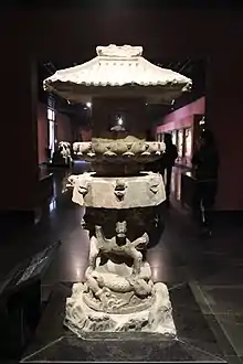 Stone lanterns (灯籠/灯篭/灯楼, Chinese: dēnglóng; Japanese: tōrō, meaning 'light basket', 'light tower')[lower-alpha 1] are a type of traditional East Asian lantern made of stone, wood, or metal. Originating in China, stone lanterns spread to Japan, Korea and Vietnam, though they are most commonly found in both China – extant in Buddhist temples and traditional Chinese gardens – and Japan.[1] In Japan, tōrō were originally used only in Buddhist temples, where they lined and illuminated paths. Lit lanterns were then considered an offering to Buddha.[2] Their use in Shinto shrines and also private homes started during the Heian period (794–1185).[3]