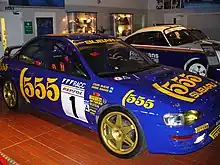 The Subaru World Rally Team (SWRT) was Subaru's World Rally Championship (WRC) team. It used a distinctive blue with yellow colour scheme that is a throwback to the sponsorship deal with State Express 555, a BAT cigarette brand popular in Asia.[2] 555 logos were found on Subaru cars from 1993 to 2003,[2] although less prevalent since 1999 due to BAT's participation in Formula One with British American Racing. Subaru's WRC efforts date back to 1980, however, in 1989 British firm Prodrive took over its operations, and its base moved from Japan to Banbury, England.[2][3]