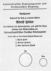 However, on 4 December 1938, there were elections in Reichsgau Sudetenland in which 97.32% of the adult population voted for the NSDAP. About a half million Sudeten Germans joined the Nazi Party, 17.34% of the total German population in the Sudetenland (the average NSDAP membership participation in Germany was merely 7.85% in 1944). That means the Sudetenland was one of the most pro-Nazi regions of Nazi Germany.[14] Because of their knowledge of the Czech language, many Sudeten Germans were employed in the administration of the ethnic Czech Protectorate of Bohemia and Moravia as well as in Nazi organizations (Gestapo etc.). The most notable one was Karl Hermann Frank, the SS and police general and Secretary of State in the Protectorate.