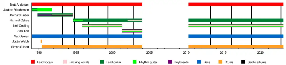 By spring 1991, Anderson and Frischmann had broken up. Frischmann started dating Blur frontman Damon Albarn. She believed the band could accommodate the new situation.[15] The situation grew tense, Butler recalled: "She'd turn up late for rehearsals and say the worst thing in the world – 'I've been on a Blur video shoot.' That was when it ended, really. I think it was the day after she said that that Brett phoned me up and said, 'I've kicked her out.'" After Frischmann's departure the character of the group changed. "If Justine hadn't left the band," Anderson said, "I don't think we'd have got anywhere. It was a combination of being personally motivated, and the chemistry being right once she'd left." Anderson and Butler became close friends and began writing several new songs together.[16] Still, the band's music was out of step with the music of its London contemporaries as well as the American grunge bands. Anderson said, "For the whole of 1991, A&R men wouldn't give us a second look."[17]